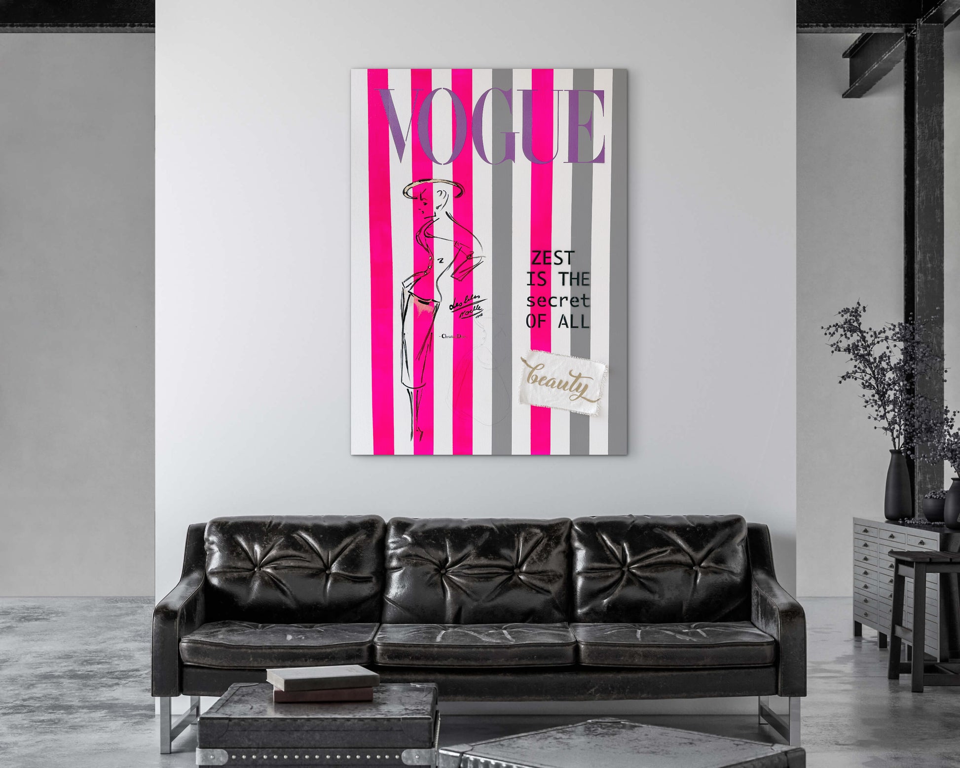 In dem Gemälde "Vogue meets Dior" treffen zwei Ikonen aufeinander: die zeitlose Eleganz von Christian Diors berühmter Skizze von 1948 und das stilvolle Flair der Vogue. Das Kunstwerk fängt die Essenz der Mode ein und verkörpert die Fusion von Vergangenheit und Gegenwart.